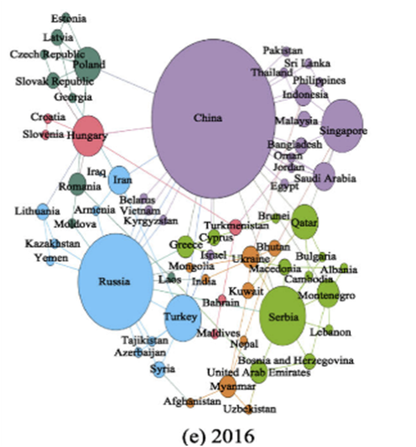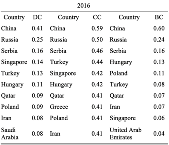Furthermore, in a paper written by four Chinese scholars, Liu Zhigao, Wang Tao, Jung Won Sonn, and Chen Wei, designed to analyze the evolution of the BRI, a metric of centrality was established to study the role of various countries in economic trends across the world including the BRI. The centrality of major countries in the economic networks across the world influenced small states, and thus the latter gravitated towards them, becoming a part of their ‘community.’ The paper identified three kinds of centrality: degree centrality (DC) which records the number of connections one country has with others; closeness centrality (CC) which is a measure of the geodesic distance of one country to another; and betweenness centrality (BC) that measures how much a country acts as an intermediary or gatekeeper in the trade network.[49] The following table displays the top 10 countries in each kind of centrality influencing global trade in 2016: